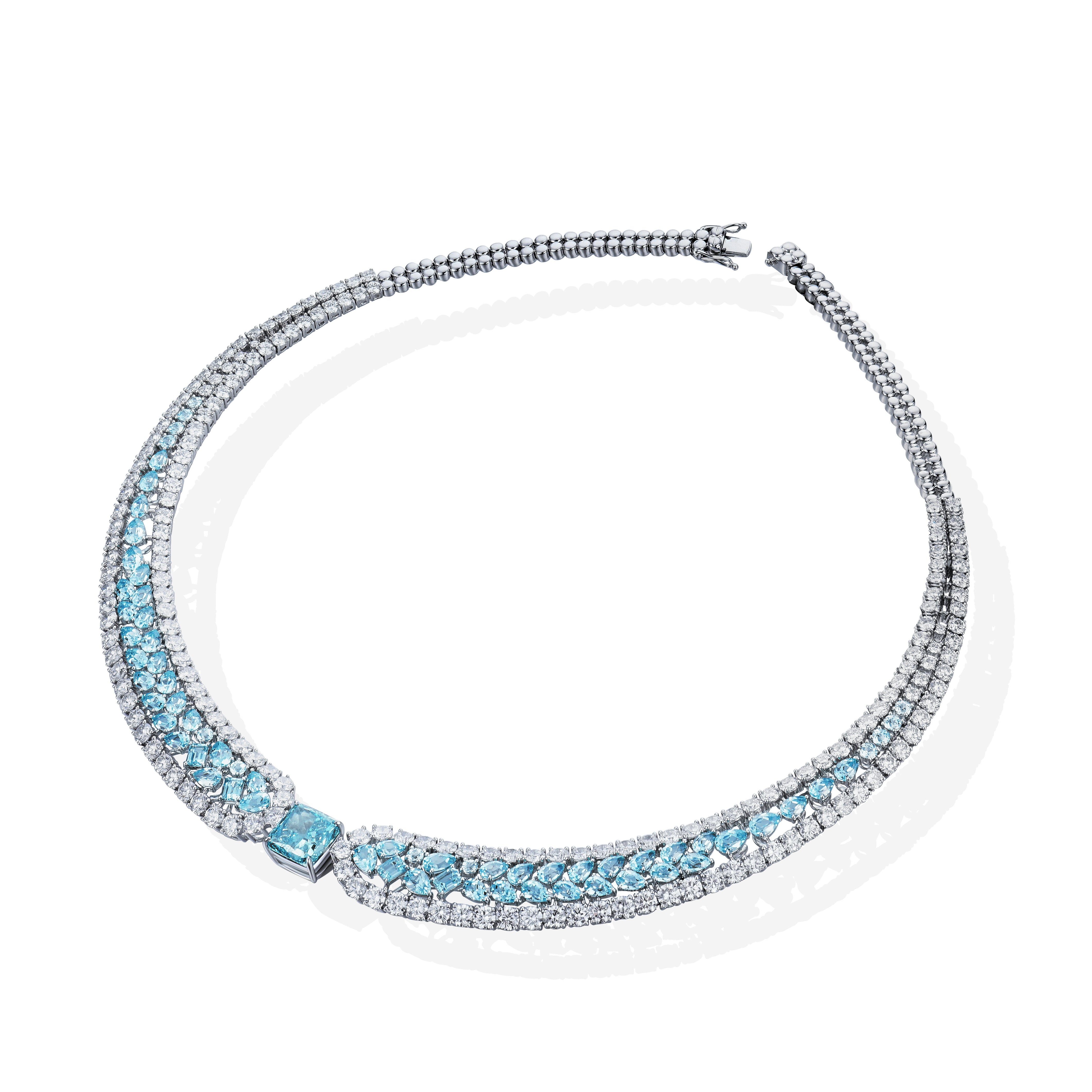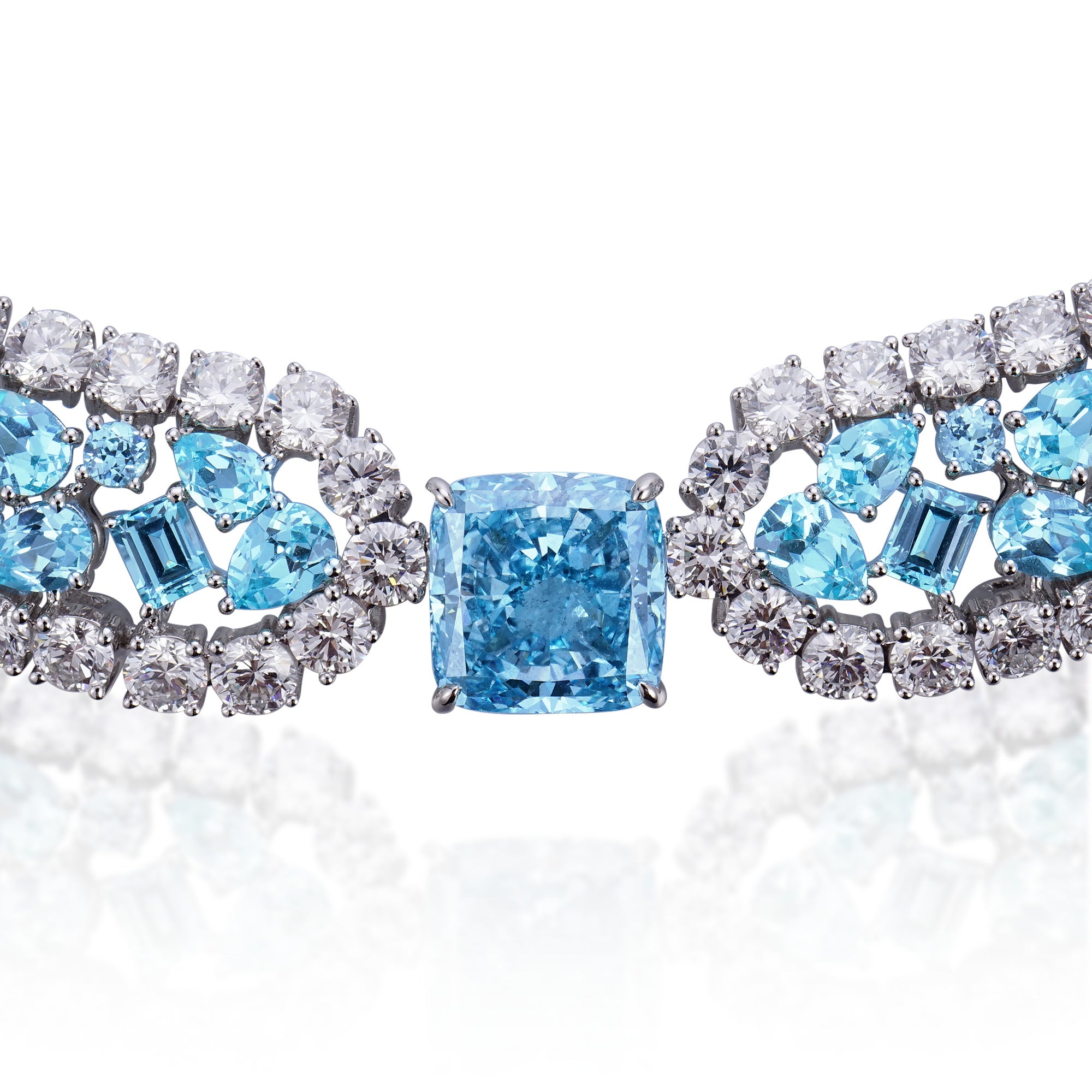 Collier luxos din aur alb 18K (AUR750) cu diamante de cultură albastre, având o piatră principală de 5.260 ct și diamante de accent în greutate totală de 1.048 ct (21 pietre).